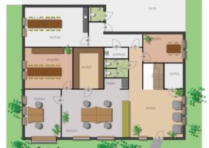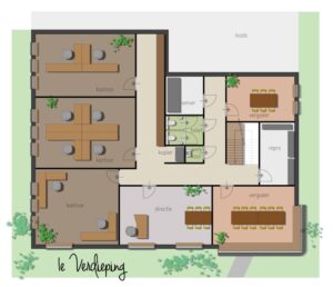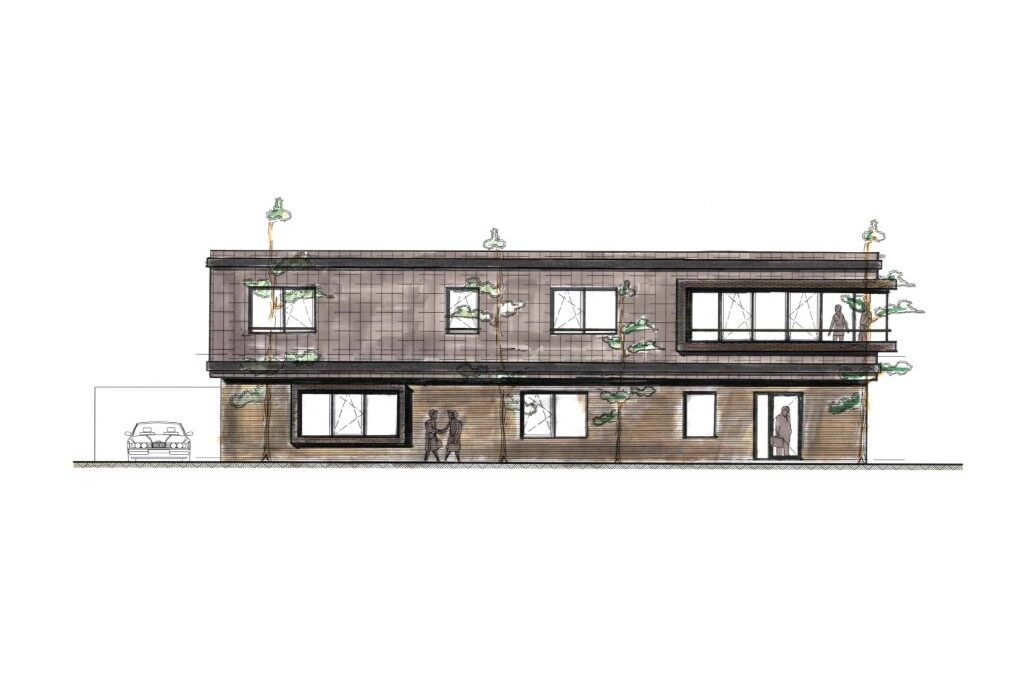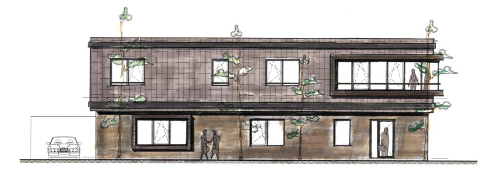 Nijverheidsweg Ontwerp van een nieuw kantoorpand tezamen met een werkplaats. Het kantoorpand is vormgeven middels een opbouw bekleed met leisteen welke zich vormt als kist met spanbanden. De plint is opgebouwd met een grove baksteen structuur.